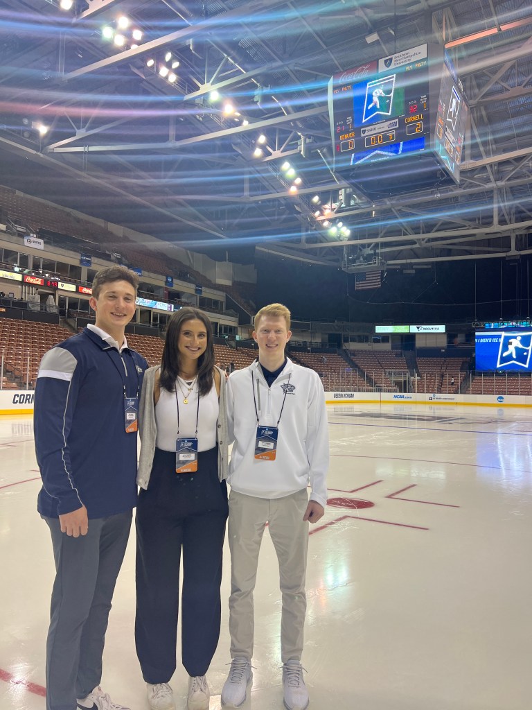 Later in the year, after the football season, I switched to a Communications intern to take on new responsibilities and try some new things. As a Comms. Intern, I control the social media accounts for all the sports teams, as well as UNH Athletics. During my time as a Comms. Intern, I have made graphics to post on socials, recorded and entered game stats during hockey games, captured and uploaded game clips to social media, written game recaps for basketball games, as well as captured crowd energy and game highlights to post on Instagram Stories and interview athletes for local news channels.
