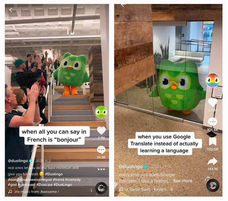 As a member of Gen Z, it is clear to me that Duolingo is actively engaging with the humor and trends of this generation. They are consistently keeping up with the rapidly changing trends on TikTok. For example, one of their most recent TikTok posts features their iconic mascot “Duo the Owl” doing the viral “Maps” dance. The song “Maps” by the Yeah Yeah Yeahs has over 1 million posts. By participating in this trend, Duolingo demonstrates awareness of trends that resonate with Generation Z, promoting a sense of connection and relevance to them. Not only are they consistent with this type of humor in their posts, they are also constantly responding to the thousands of comments that they receive. A user commented under a video “My Duolingo streak ended at 108 so I just stopped”. Duolingo responded to this with “Ellee your dad and I are disappointed”. The humanization of the brand effectively communicates their brand’s message while appealing to a specific audience. Duolingo is not only enhancing its relatability, but is also building a community of users who value the brand’s authentic and fun approach to language learning.