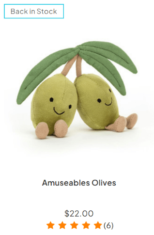 The “Back in Stock” tag creates a sense of urgency, encouraging customers to buy the plushie quickly before it’s gone again.