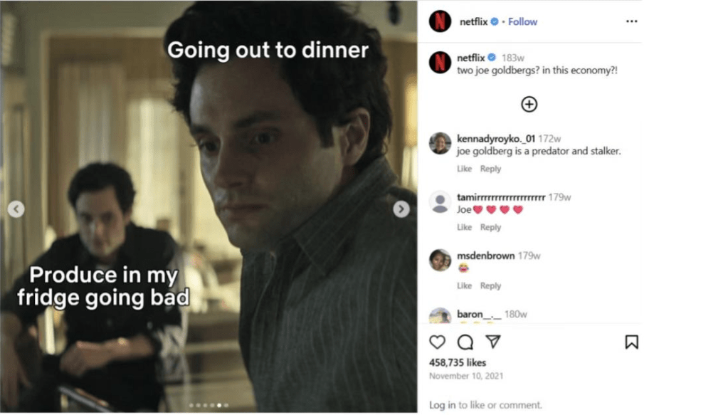 Netflix is a great example of a brand that uses meme marketing because, as a streaming service, they can use images or shots from their productions to create marketing memes. This is effective because Netflix’s target audience is mostly younger people under 35. By referencing one of their original shows, “You,” Netflix creates a humorous and relatable environment for their audience, demonstrating an informal but effective marketing approach.
