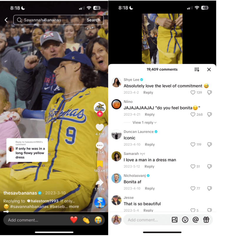 The Savannah Bananas, a baseball team, successfully used TikTok for meme marketing in 2023. One video showed a player lip-syncing and dancing to Lizzy McAlpine’s song “Ceilings” while wearing a dress under his uniform. By hopping on a popular trend, the team reached a wide audience and engaged fans both online and in real life. This strategy helped build a fun, humorous, and positive brand personality, gaining millions of followers on TikTok.