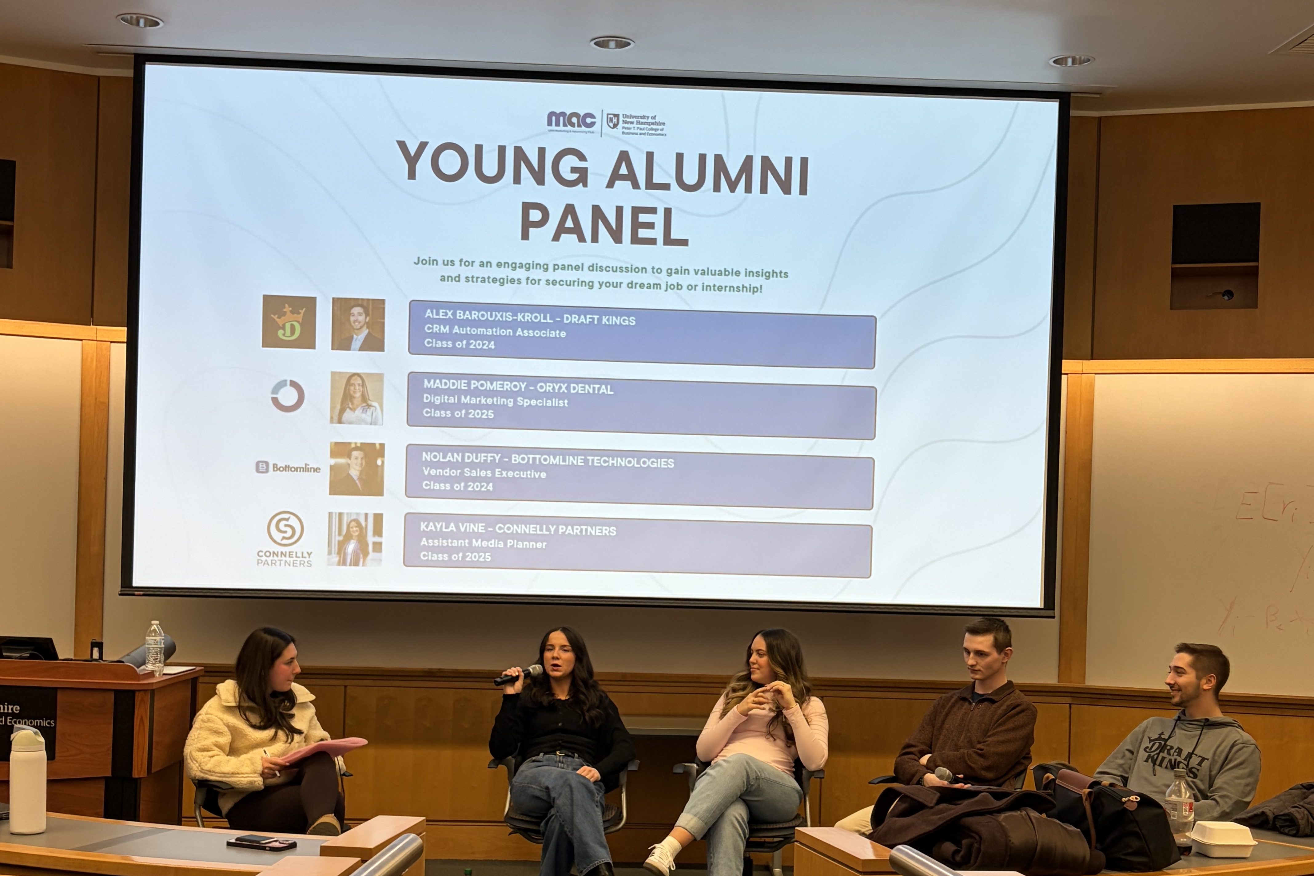On February 4th, MAC and AMA members had the opportunity to attend an engaging Young Alumni Panel that provided real-world insight into life after graduation. Featuring recent graduates working across sales, media planning, digital marketing, and CRM automation, the panel offered honest advice about navigating the transition from college to a full-time career. The event reinforced the value of networking, involvement, adaptability, and continuous learning, all essential qualities for students preparing to enter the marketing industry.
