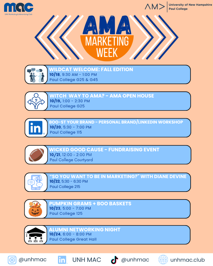 Welcome to AMA Marketing Week, an engaging week of events designed to immerse students into the dynamic world of marketing! Students from all majors and colleges are encouraged to join us for a week full of fun games, insightful speakers, networking opportunities and real-world experience.