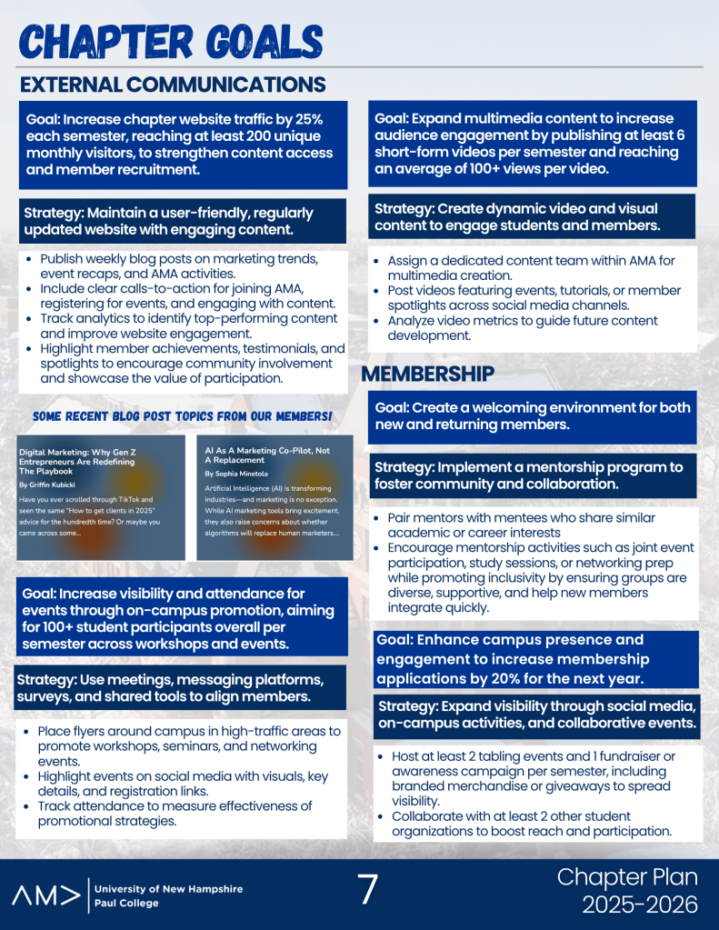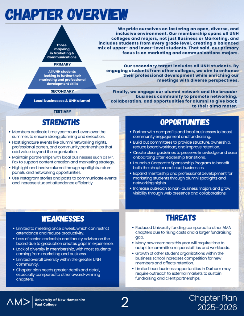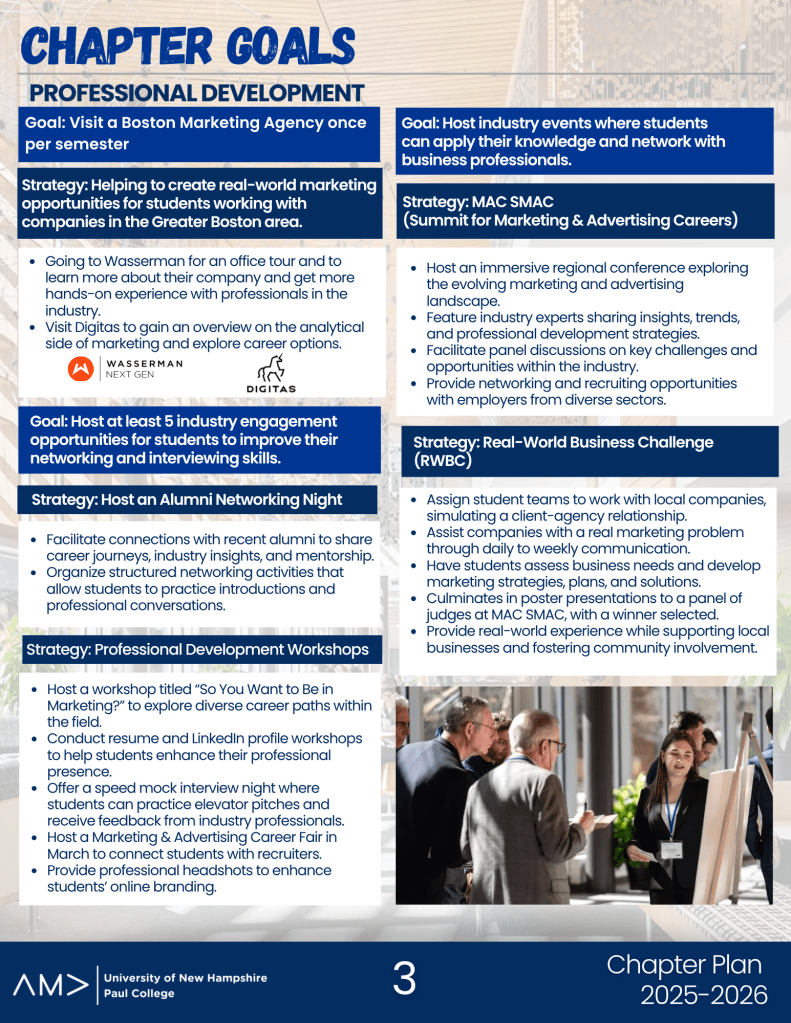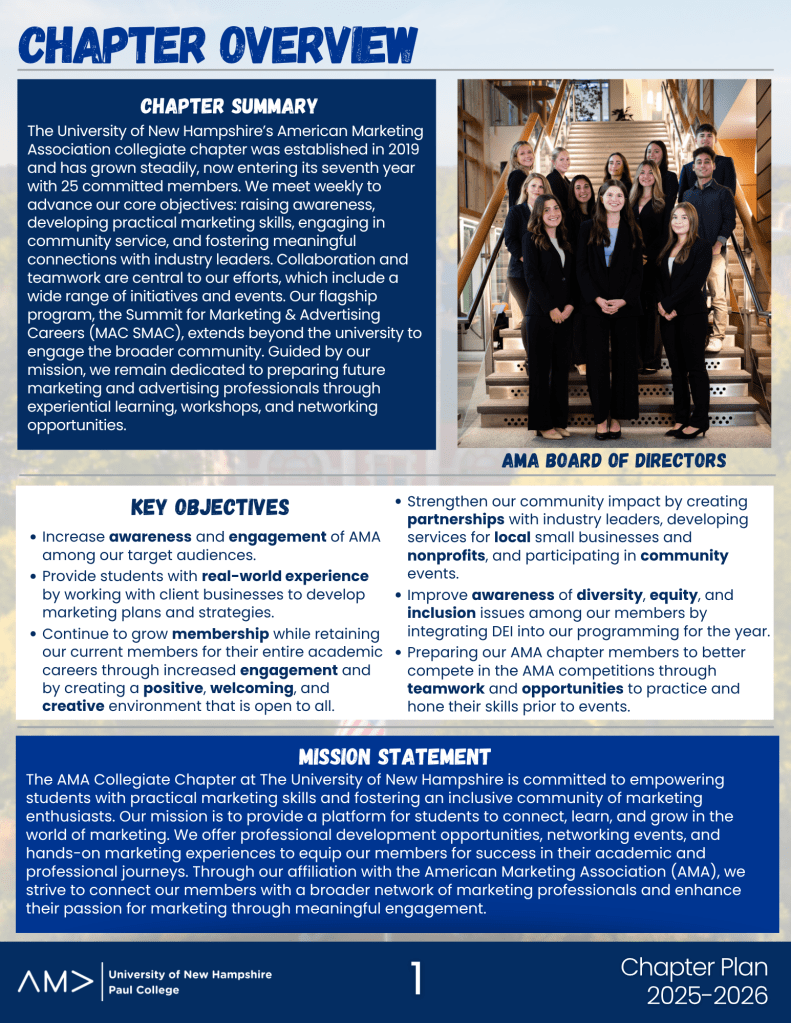 We are committed to empowering students with practical marketing skills and fostering an inclusive community of marketing enthusiasts. Our mission is to provide a platform for students to connect, learn, and grow in the world of marketing. We offer professional development opportunities, networking events, and hands-on marketing experiences to equip our members for success in their academic and professional journeys. Through our affiliation with the American Marketing Association (AMA), we strive to connect our members with a broader network of marketing professionals and enhance their passion for marketing through meaningful engagement.