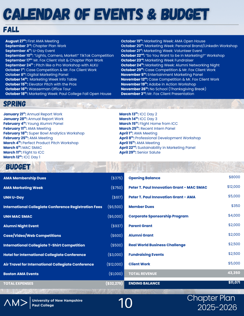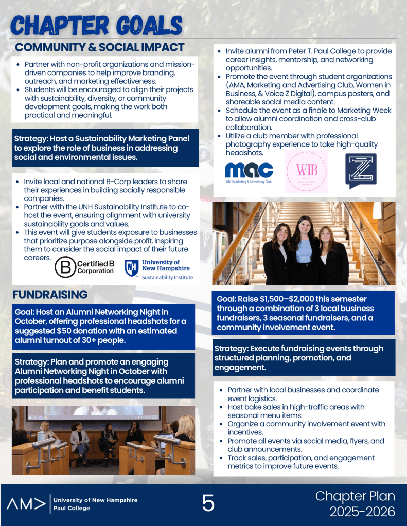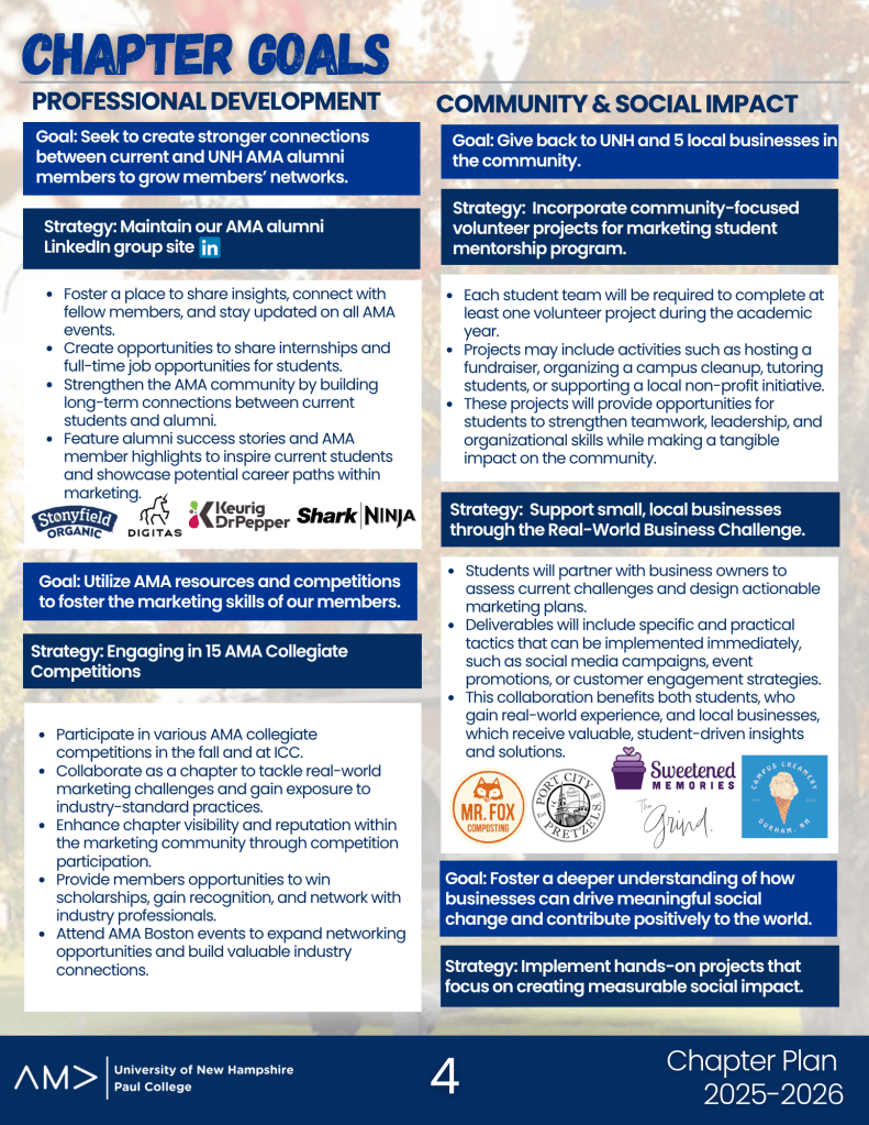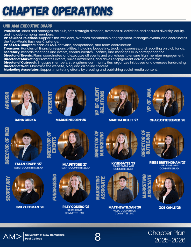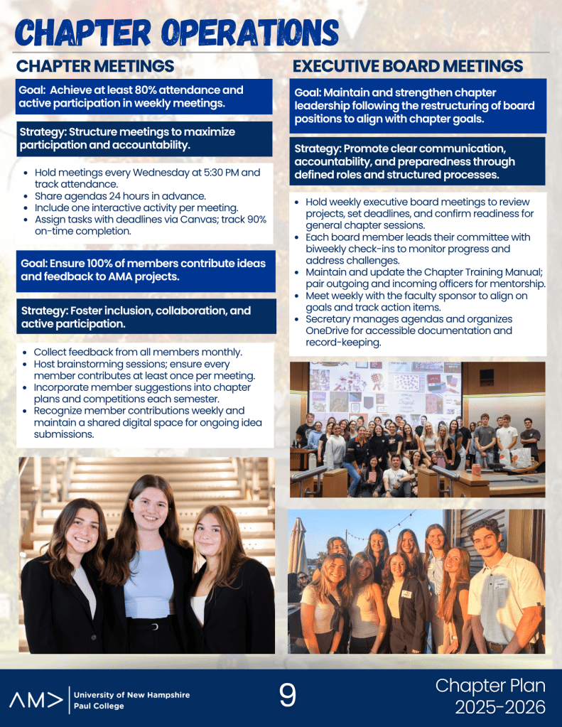 We are committed to empowering students with practical marketing skills and fostering an inclusive community of marketing enthusiasts. Our mission is to provide a platform for students to connect, learn, and grow in the world of marketing. We offer professional development opportunities, networking events, and hands-on marketing experiences to equip our members for success in their academic and professional journeys. Through our affiliation with the American Marketing Association (AMA), we strive to connect our members with a broader network of marketing professionals and enhance their passion for marketing through meaningful engagement.