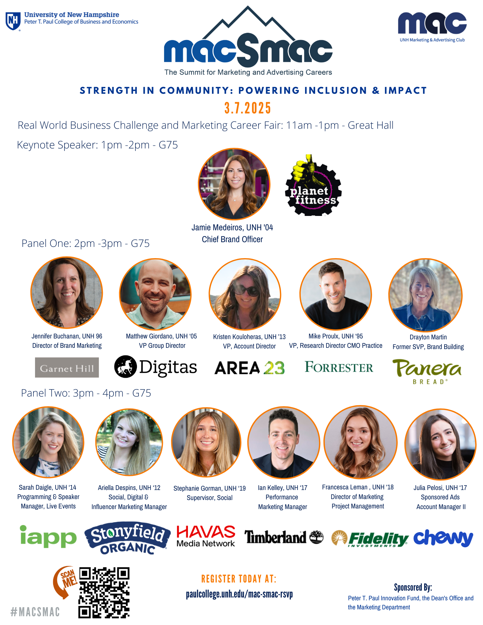 MAC’s Summit for Marketing and Advertising Careers (SMAC) is one of UNH Paul College’s signature and largest annual events. Held every spring, the summit offers students, faculty/staff, community members, and business professionals a unique opportunity to engage directly with industry leaders from top brands. Attendees can network, explore the latest marketing trends, and gain valuable insights into career paths in the field. In addition to an inspiring keynote speaker and two professional panels, we host the Real World Business Challenge and a Marketing Career Fair featuring recruiters from leading companies. This is an event you won’t want to miss.